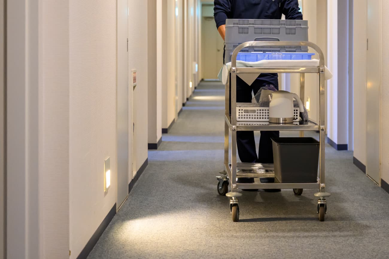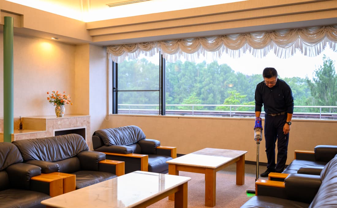 「清掃業務」と「施設・設備管理業務」の両面を担当します。 清掃業務では、クラブハウス内のロビーやレストラン、水回りなどの清掃、併設ホテル「HOTEL NICC」(全15室)の客室および共用部の清掃を行い、常に清潔な空間を保ちます。 ホテル清掃においては、お客様がチェックアウトされた後、ベッドメイク、タオルやアメニティのセット・補充、室内外の掃除機がけなどまで手際よく行います。 また、施設管理業務では、ボイラー室の点検や、今年導入された「人工温泉」を作るための濾過器(水質浄化機械)のメンテナンスなどを担当します。機械の数値チェックや異常がないかの確認は、お客様の安全に関わる責任ある仕事です。 誰が見ていなくても手を抜かず、隅々まで美しく整えるプロ意識が求められます。パートスタッフと協力し、午前中の清掃から午後の設備点検まで、幅広く担当します。